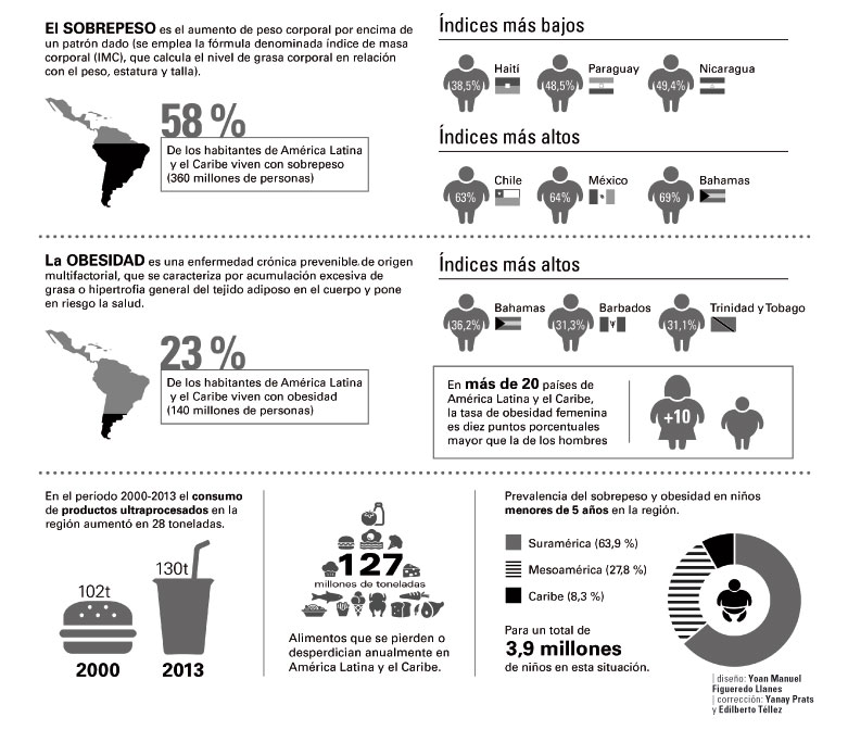 Las cifras son aplastantes: cerca del 58 % de los habitantes adultos de América Latina y el Caribe vive con sobrepeso (unos 360 millones de personas), mientras que el 23 % (140 millones) padece de obesidad. Tales datos, divulgados por la Organización de las Naciones Unidas para la Alimentación y la Agricultura (FAO) en su informe Panorama de la Seguridad Alimentaria y Nutricional 2016, demuestran que aun cuando se ha reducido el hambre en la zona, otras formas de malnutrición continúan afectando a los pobladores del área.