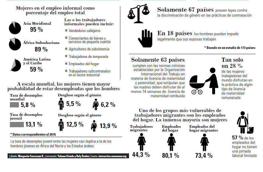 El ámbito del empleo es uno de los más desiguales. Un estudio divulgado recientemente por la Organización de Naciones Unidas (ONU) asegura que las trabajadoras solo reciben 77 céntimos por cada dólar que ganan los hombres.