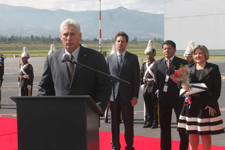 Al llegar a esta hermosa tierra andina, nuestro fraternal y cálido saludo para el pueblo ecuatoriano, afirmó Díaz-Canel a su arribo al aeropuerto internacional Mariscal Sucre, donde fue recibido por el canciller ecuatoriano, Guillaume Long.