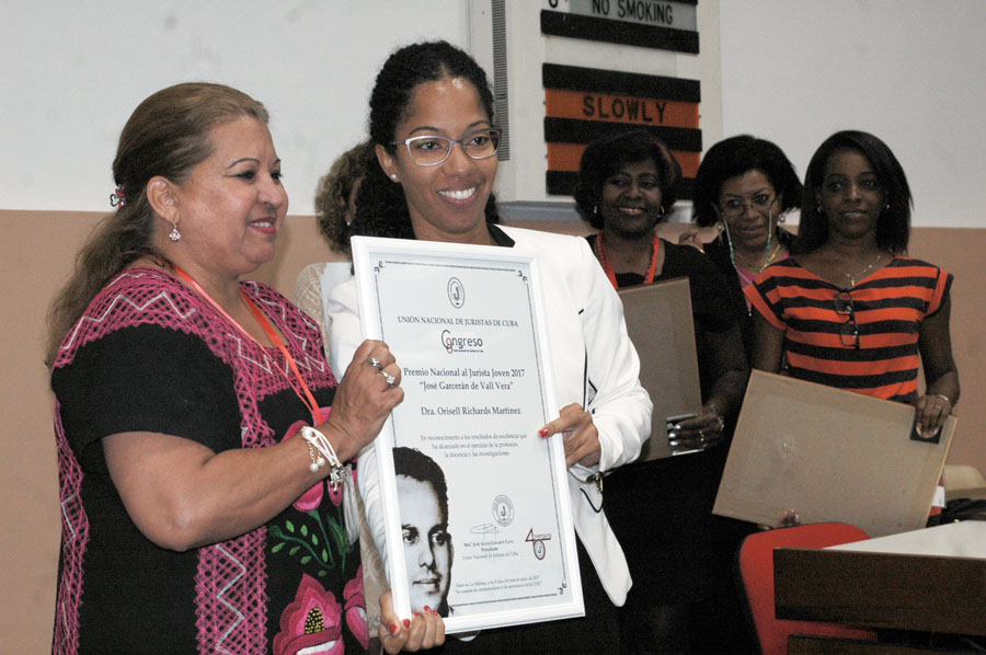 La doctora Orisell Richard Martínez, profesora de la facultad de Derecho de la Universidad de La Habana y vicepresidenta del Capítulo provincial de la Sociedad Cubana de Derecho Constitucional y Administrativo de la UNJC, mereció el Premio al jurista joven 2017 José Garcerán de Vall Vera, por su labor y entrega al quehacer jurídico.