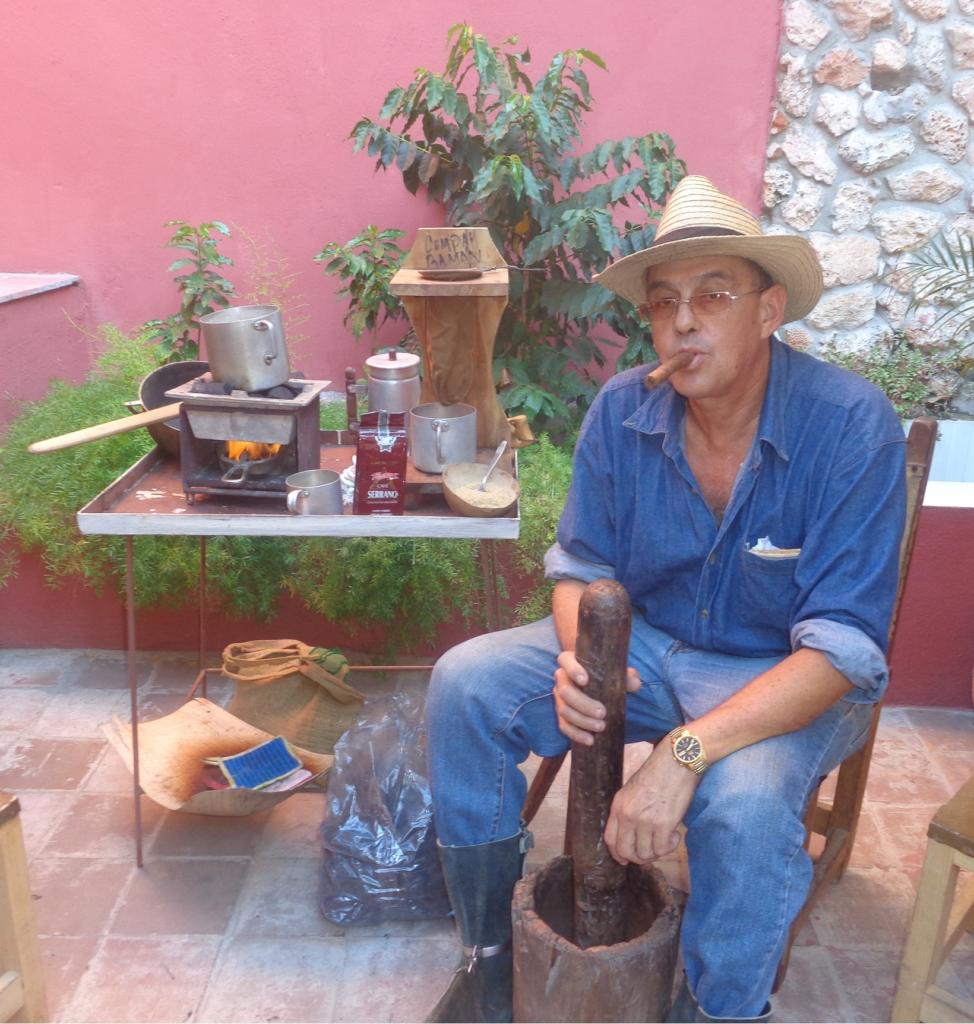 “El taburete, el pilón, el caldero de tostar el grano, un empina’o o colador, anafre y carbón para calentar el agua, jarritos metálicos, azúcar parda… todo lo que antaño generaba una ‘colada de las buenas’ está en uso en el patio de Compay Ramón para mostrarle al visitante el ritual del café cubano, ese que es parte de la idiosincrasia de este pueblo”.