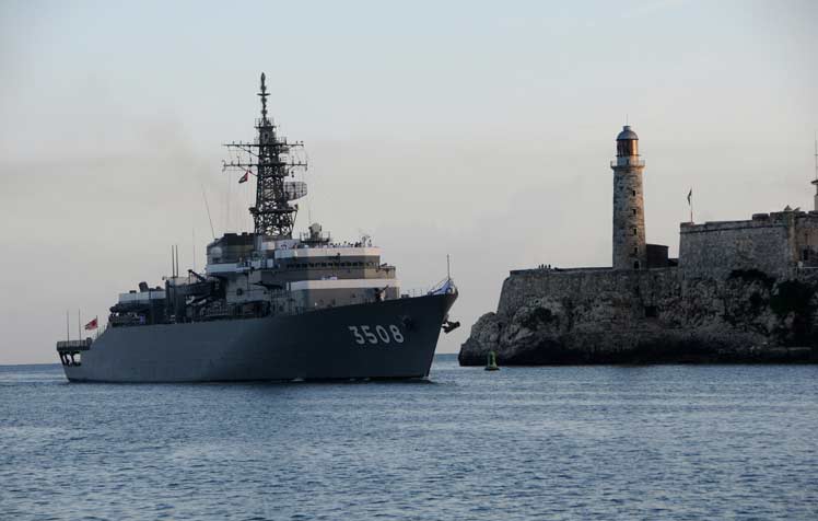 The squad is comprised by the school-ship JS Kashima and its escort ship JS Harusame. As they entered the Bay of Havana the leading vessel shot a 21-cannon salute, that was reciprocated by an artillery battery from the Fortress of San Carlos de La Cabaña that overlooks the bay.