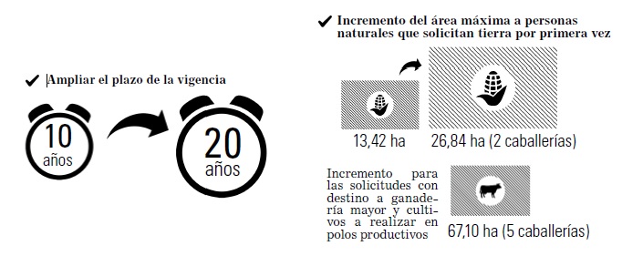 - La autorización para la construcción de bienhechurías se incrementan del 1 % al 3 % del área entregada en usufructo para las producciones agropecuarias y forestales que lo requieran.