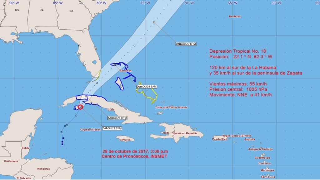 La Depresión Tropical número dieciocho se ha desplazado en las últimas horas rápidamente, muy próxima a la costa este de la Isla de la Juventud. Su región central a las 3 de la tarde se estimó en los 22.1 grados de latitud norte y los 82.3 grados de longitud oeste, posición que la sitúa a unos 120 kilómetros al sur de La Habana y 35 kilómetros al sur de la Península de Zapata, Matanzas.