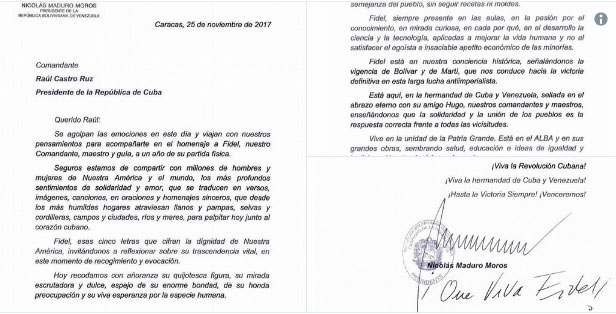 A un año del fallecimiento del líder cubano, Fidel Castro, el mandatario venezolano, Nicolás Maduro, a través de una carta que envió a su homólogo, Raúl Castro, recordó al Comandante como una figura que permanece vigente en la construcción de la Patria Grande Latinoamericana y cuyo legado histórico continúa “señalándonos la vigencia de Bolívar y Martí”.