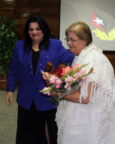 Eloísa Carrera Varona, compañera de vida del doctor Armando Hart Dávalos, recibió de manos de Nereyda López Labrada, secretaria general del SNTC el reconocimiento Aniversario 40 de dicho sindicato, otorgado de manera post mórtem, al destacado intelectual y revolucionario cubano.