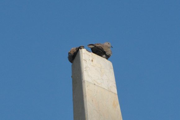La segunda paloma llegó unos dos meses después que la primera. Muchos pensaban que era un pichón; más tarde descubrieron que cortejaba a la otra a la hora en que el sol es menos fuerte. Juntas han definido una rutina: vuelan hacia los árboles circundantes y al caer la tarde regresan al monumento.