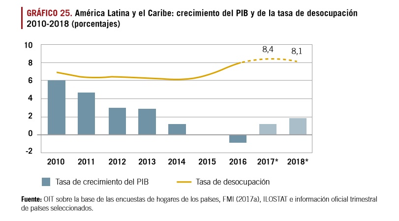 Mientras el panorama macroeconómico se muestra favorable, el mercado laboral continúa rezagado. Al concluir el 2017, la tasa de desocupación promedio de la zona subió de 7,9 a 8,4 %, cifra que se espera disminuya tímidamente en 0,3 puntos porcentuales este año.