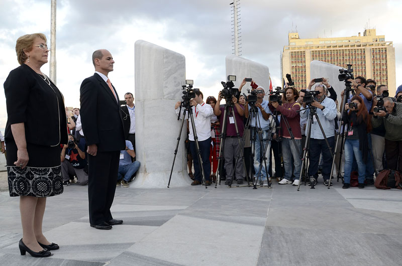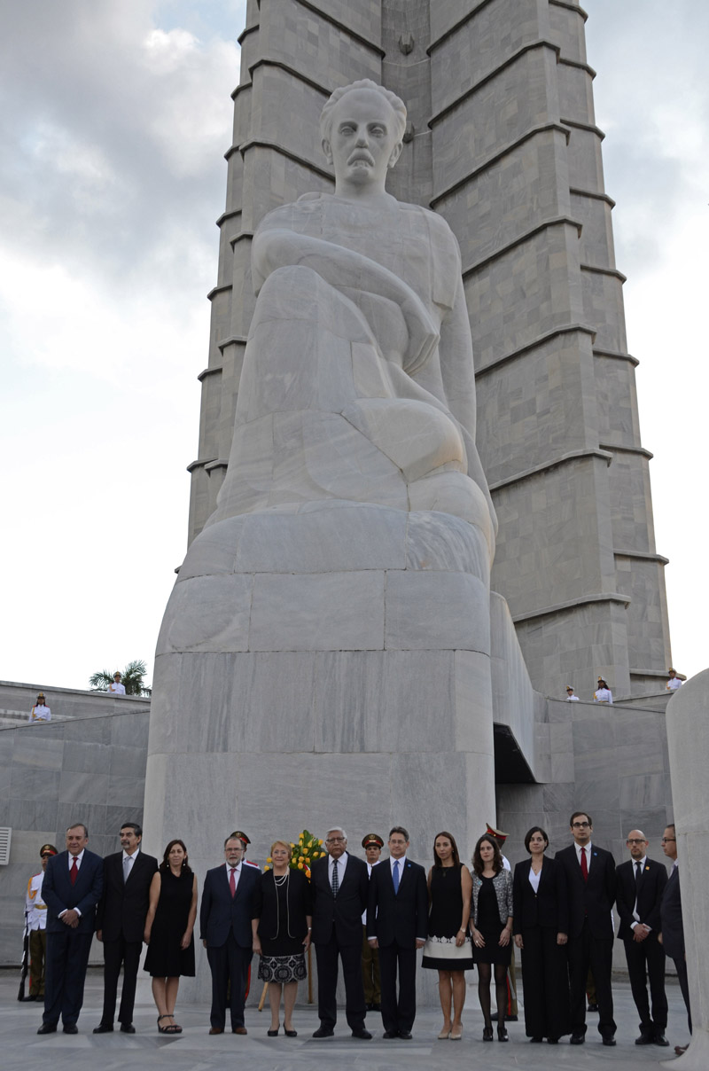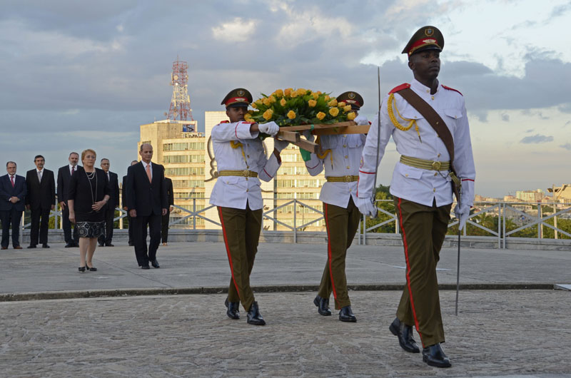 Bachelet depositó una ofrenda floral ante la base del monumento al prócer de las luchas independentistas de la mayor de las Antillas, situado en el memorial homónimo, de la Plaza de la Revolución.