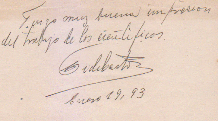 En una pausa, miró con curiosidad mi libreta de notas por la que corría presuroso el bolígrafo recogiendo sus palabras, comentó sobre lo pequeña y rápida que era mi letra, y en un gesto espontáneo que me tomó por sorpresa cogió el block. Y como para no dejar dudas de su admiración por la labor que realizan nuestros investigadores, escribió él mismo, a continuación de mis notas, sus impresiones.