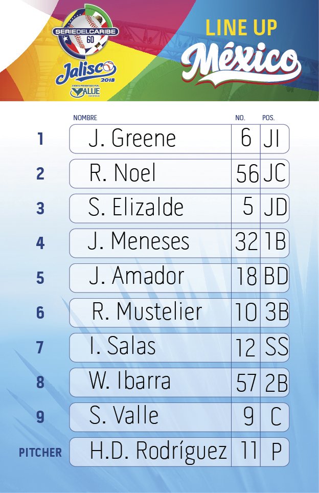 Primer Inning alta: El jardinero izquierdo Justin Green abrió con hit al jardín central. Green se robó la segunda almohadilla. El patrullero central R. Noel dio cañonazo al cental trayendo la primera anotación para México. El jardinaro derecho S. Elizalde bateó para doble play. El inicalista J. Meneses también dio hit por el centro del terreno. De inmediato Meneses se robó la segunda base con facilidad. Yera enterró la pelota. Meneses avanzó a tercera base por wild pitch. J. Amador le ganó el boleto al zurdo yumurino, complicando aún más la entrada. Ronnier Mustelier bateó por el torpedero el cual logró el tercer out forzando en la intermedia. La entrada terminó con una carrera.