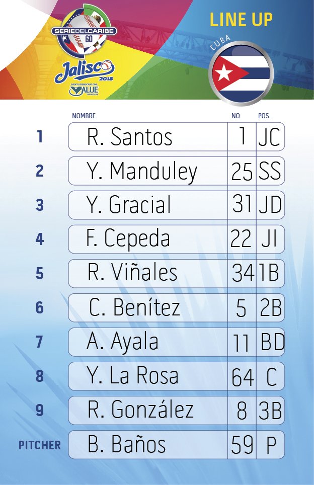 Alineación de Cuba: Roel Santos (cf), Yordan Manduley (ss), Yurisbel Gracial (rf), Frederich Cepeda (lf), Rafael Viñales (1b), Carlos Benítez (2b), Alexander Ayala (bd), Yolexis La rosa (c), Raúl González (3b), Vladimir Baños p