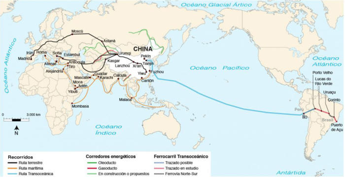 La plataforma de interconectividad terrestre y marítima, que facilitará la comunicación entre diversas regiones, incluye la construcción de líneas de ferrocarriles y puertos; oleoductos, gasoductos y centrales eléctricas; carreteras, centros logísticos y otros tipos de infraestructura.