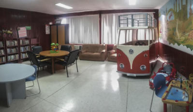 El salón donde se imparten las lecciones es espacio educativo y de recreación. Un inmenso camión de madera, un “carrito” mediano y un juego para mover pequeños aros se hallan de un lado. Y del otro, la biblioteca, la pizarra y diversos utensilios para la enseñanza.