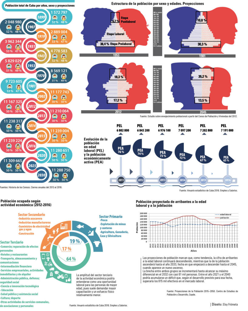 Datos del 2016 ofrecidos por la Oficina Nacional de Estadística e Información (Onei) aseguran que el 20 % de la población total de Cuba ha superado la edad de jubilación, que según la legislación actual, y sin ser obligatoria, se ha establecido en seis décadas para las mujeres y un lustro más para los hombres.