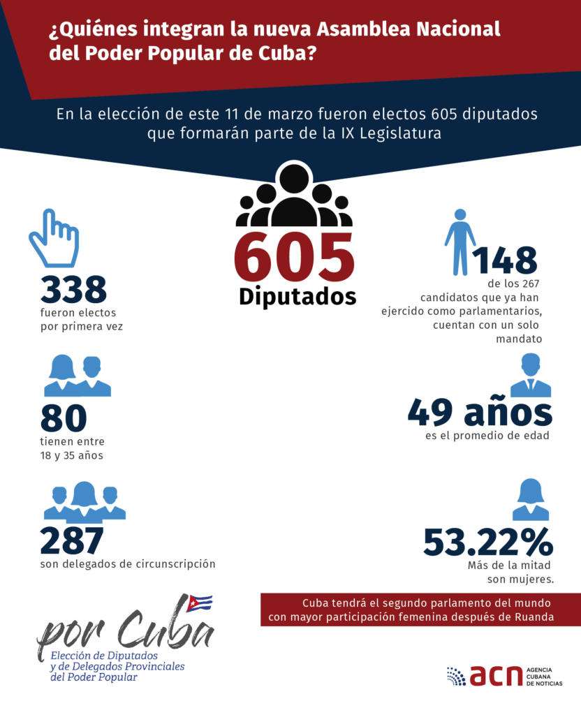 De los 605 diputados que conformarán la IX Legislatura de la Asamblea Nacional del Poder Popular, para el próximo mandato de cinco años, el 53,22 por ciento son mujeres, con lo cual el Parlamento cubano se ratifica como el segundo en el mundo con mayor participación femenina, luego del de Ruanda.