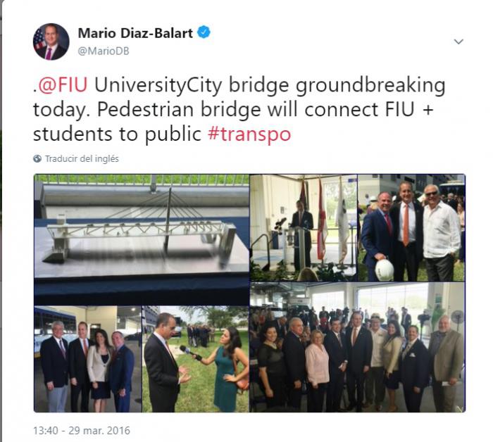 Y Diaz-Balart, quien es el presidente del Subcomité de Asignaciones de la Cámara de Representantes para el Transporte, la Vivienda y el Desarrollo Urbano, fue fundamental para crear apoyo para la consrucción del puente. El fin de semana pasado, FIU elogió al congresista, junto con la representante Debbie Wasserman Schultz, por hacer que el proyecto se hiciera realidad.