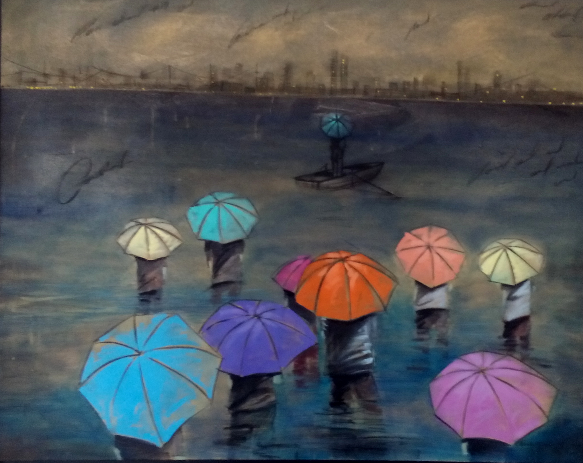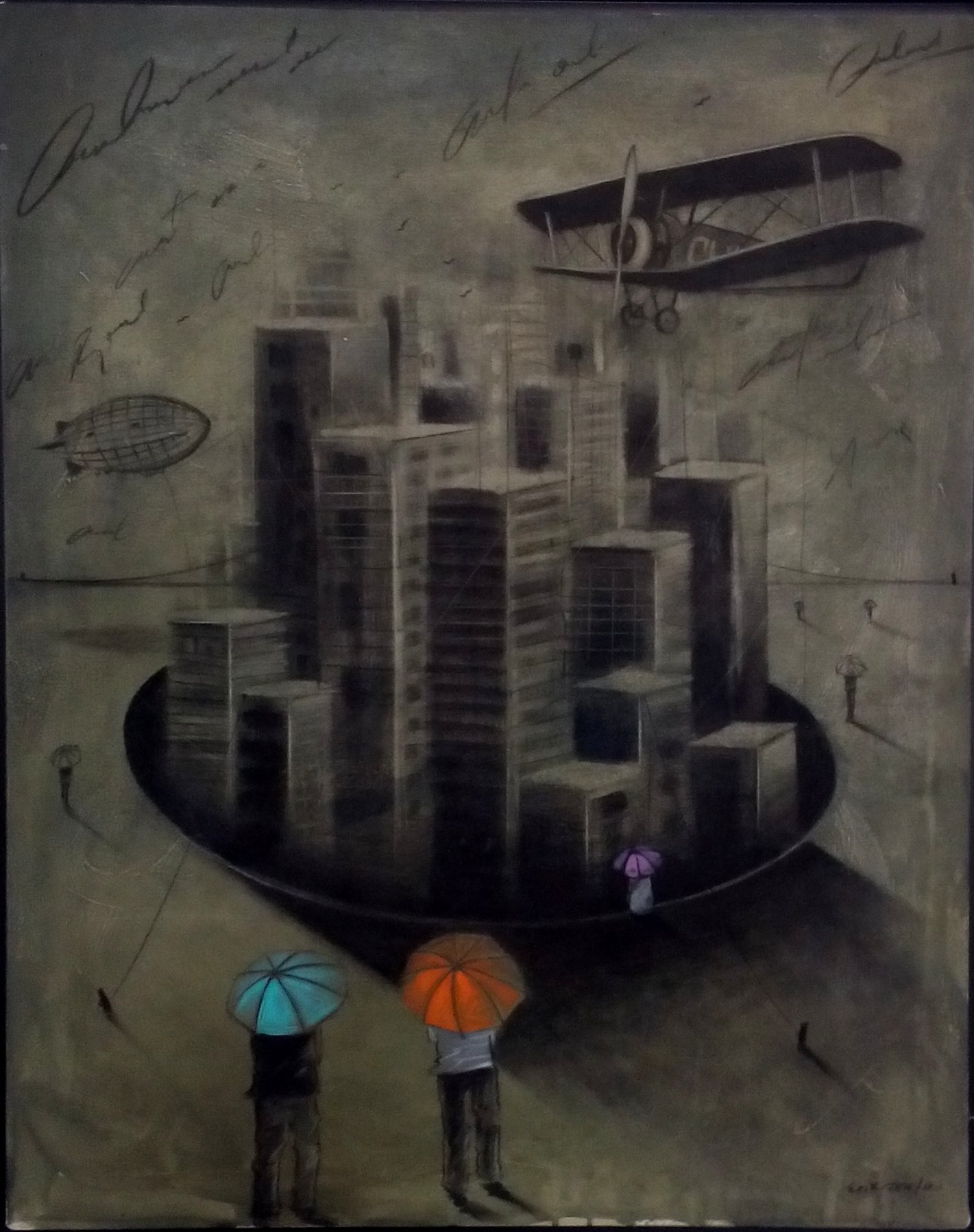 Las sombrillas y los paraguas son emblemas milenarios —aludidos por grandes artífices a través de la historia del arte universal—, su representación en el lejano oriente rememora al cielo y a la realeza; y se encuentra entre los ocho símbolos de fortuna del budismo. El paraguas es, además, distintivo de austeridad y estatus, e igualmente simboliza la riqueza. Sobre esos atributos descansa la fuerza conceptual de las tesis pictóricas de Erik, mezcla de imaginación y de realidad que discurre desde su subconsciente para exteriorizarse sobre la tela o la cartulina, en matices ricos en tonalidades frías y cálidas que configuran ambientes de particular belleza expresiva.