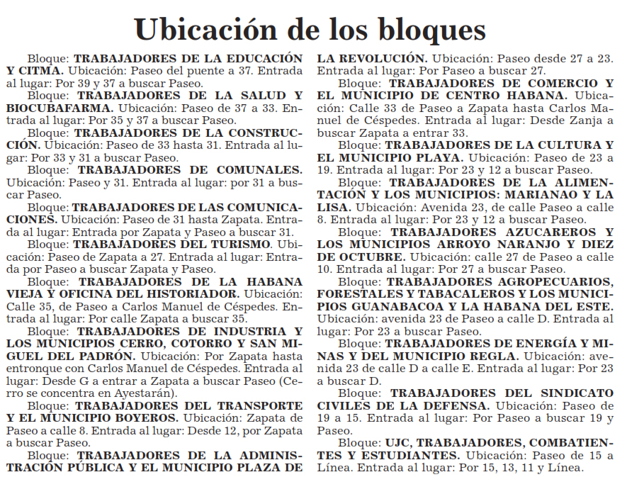 La Comisión Provincial de Seguridad Vial de La Habana informa a la población y en particular a los conductores de vehículos en la capital que con motivo del acto central por el Día Internacional de los Trabajadores, el próximo 1ro de Mayo en la Plaza de la Revolución José Martí se adoptarán medidas especiales de cierre de la circulación vial y prohibición de estacionamiento en las avenidas y calles que a continuación se relacionan: