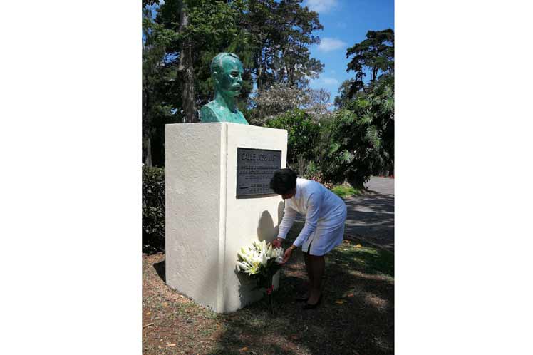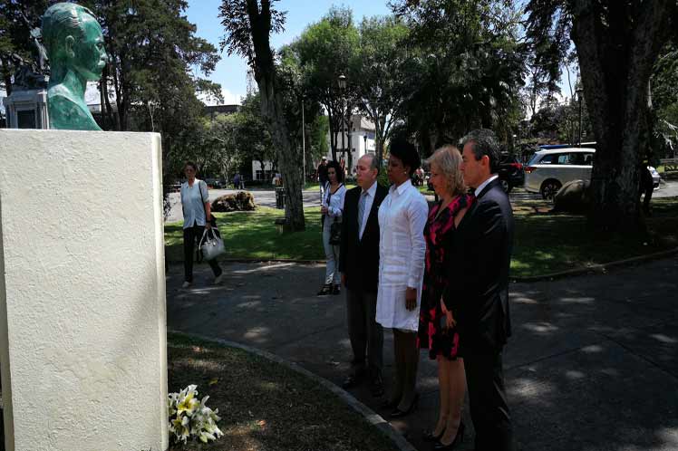 La vicepresidenta se interesó por el origen del busto de Martí en tan emblemático sitio de Costa Rica y el embajador de Cuba en esta nación centroamericana, Danilo Sánchez, le explicó que fue colocado ahí por la Municipalidad de San José el 28 de enero de 1953, con motivo del centenario del natalacio del Héroe Nacional cubano.