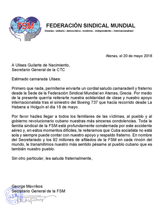 Organizaciones sindicales de varias partes del mundo hicieron llegar durante el transcurso de esta semana mensajes de solidaridad y condolencias al pueblo cubano y a los familiares de las víctimas del accidente aéreo ocurrido el pasado 18 de mayo.