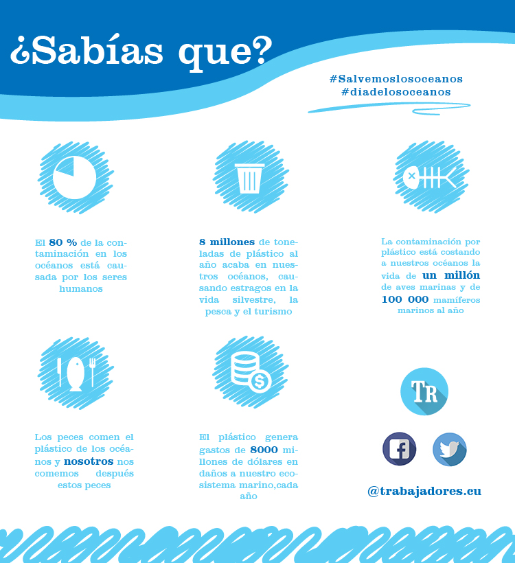 En este Día Mundial de los Océanos queremos resaltar el problema de la contaminación por plástico. El 80% de la contaminación de los mares se origina en tierra, y esto incluye unos 8 millones de toneladas de desechos de plástico por año. Los desechos de plástico obstruyen las vías fluviales, perjudican a las comunidades que dependen de la pesca y el turismo, matan a tortugas y aves, ballenas y delfines, y llegan a las zonas más alejadas del planeta y a todos los eslabones de la cadena alimentaria de la que dependemos en última instancia. A menos que invirtamos la tendencia, dentro de poco podría haber más desechos de plástico que peces en los océanos.
