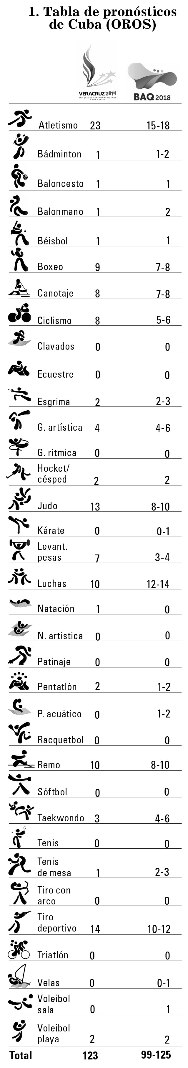 Los pronósticos que acompañan este trabajo (VER TABLA 1) parten del sabor dorado conseguido en Veracruz 2014 y el entorno —mínimo y máximo— de oros por el que deben moverse los 34 deportes con presencia cubana en Barranquilla 2018. No es pura intuición periodística este vaticinio, se basa en los resultados obtenidos durante la ruta crítica, la rivalidad y crecimiento regional, así como el momento actual: físico, técnico y psicológico por el cual transitan nuestros atletas.