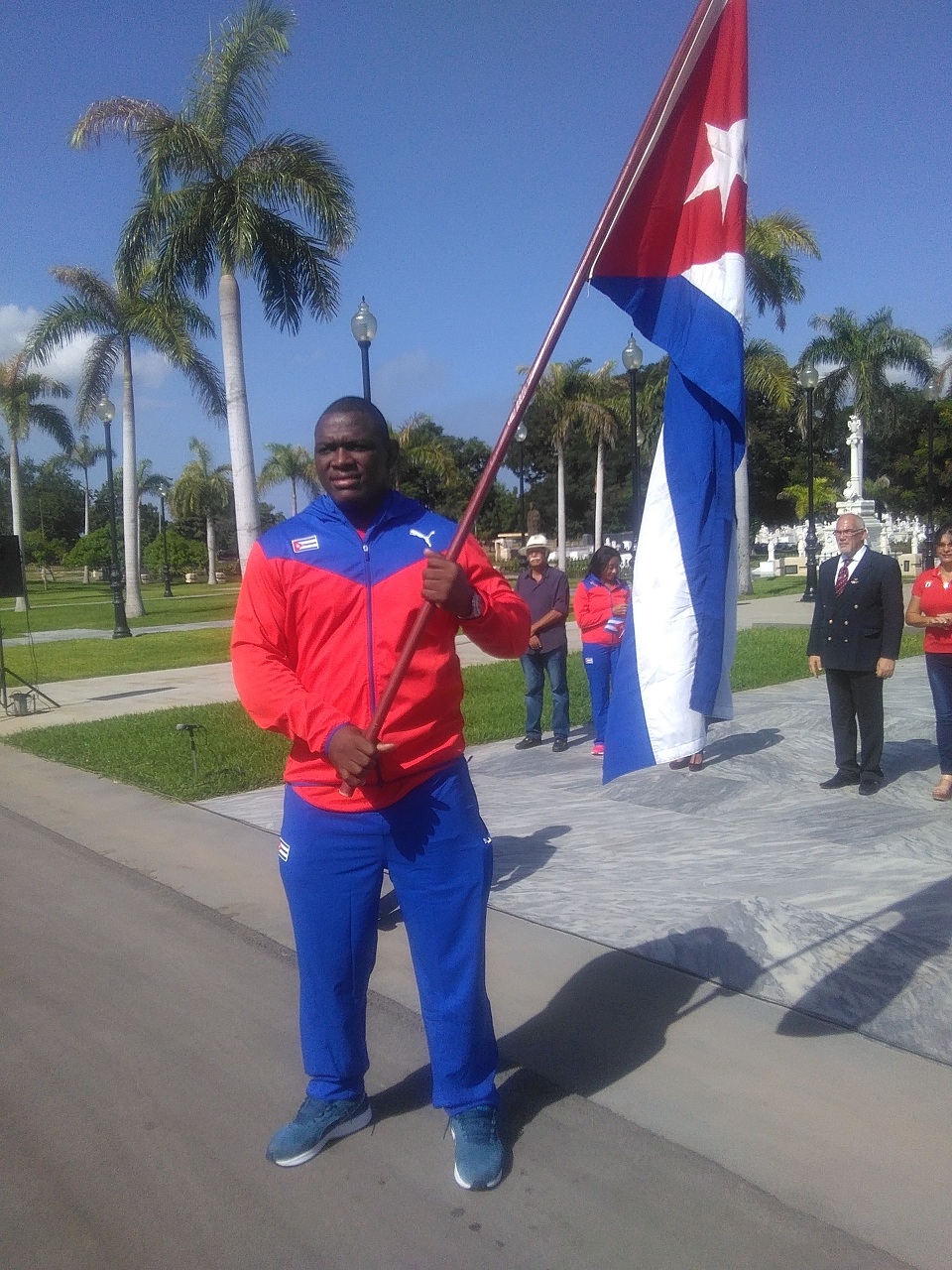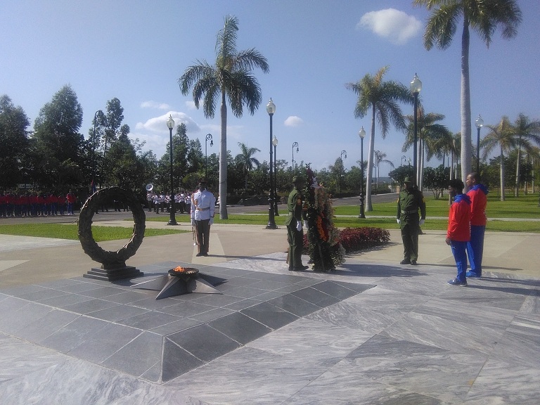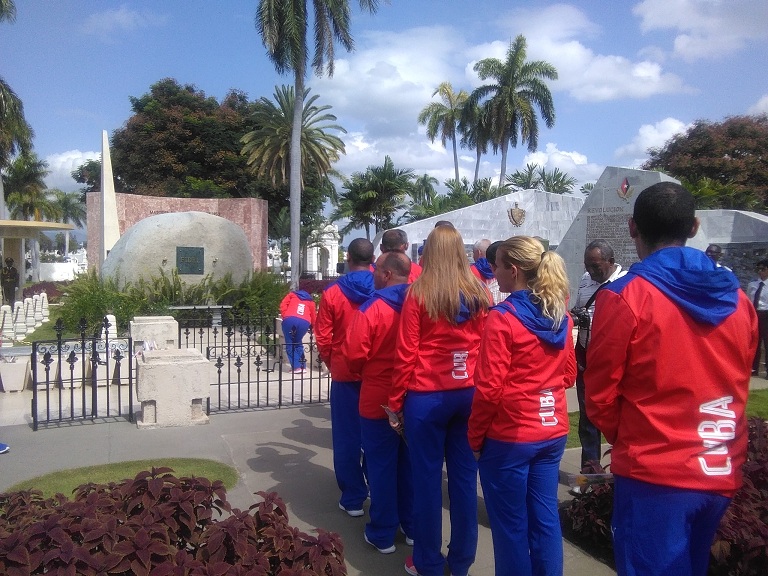 Minutos antes había sido depositada una ofrenda floral a nombre de la delegación cubana a Baranquilla 2018 ante la llama eterna de la necrópolis santiaguera, acompañada por los atletas Manrique Larudet, subcampeón mundial y medallista panamericano y centroamericano de gimnasia artísticas y Frederich Cepeda campeón olímpico de béisbol, Atenas 2004.