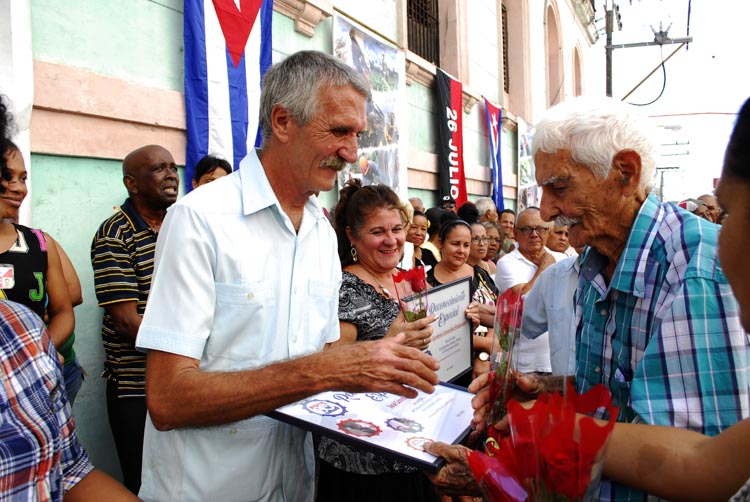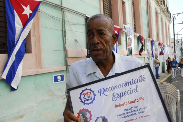 Roberto Cuesta atesora 46 años en el movimiento sindical. Sostiene en sus manos el Diploma de reconocimiento por su destacado desempeño. “Todos nosotros, los que hemos sido estimulados, recordaremos siempre este acto por el significado que tiene y el orgullo que sentimos.