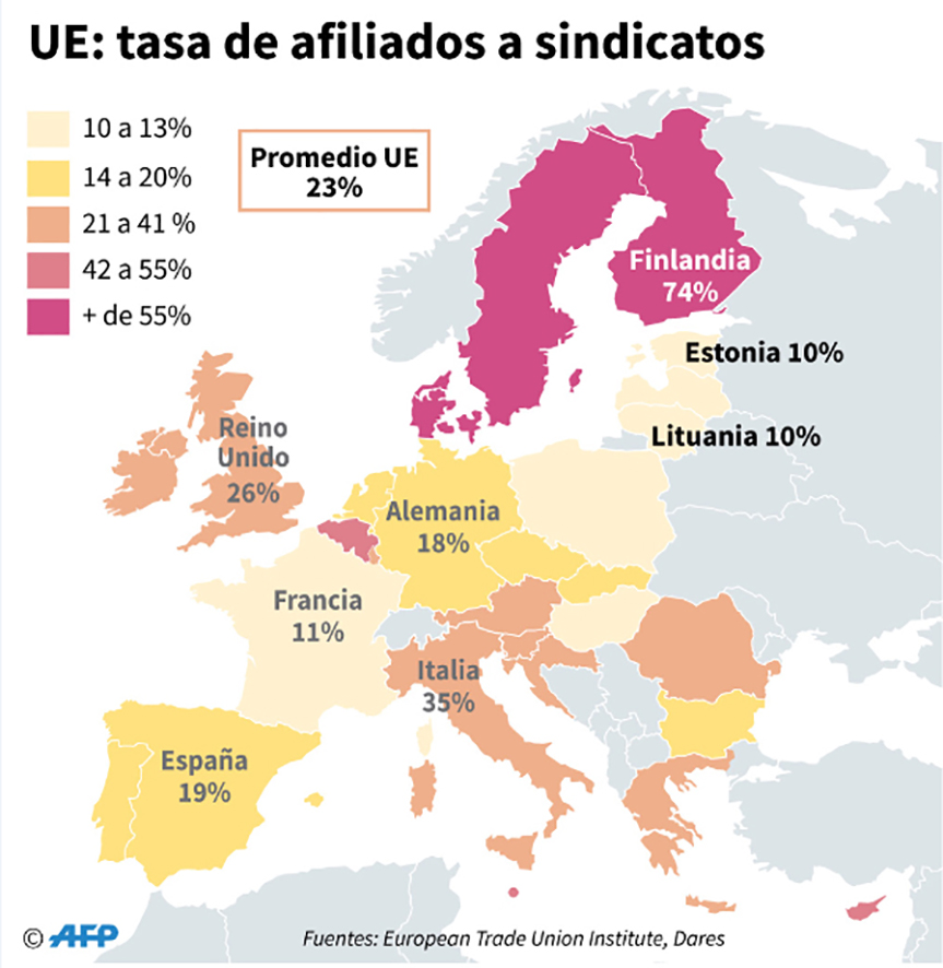 No obstante, las situaciones varían según los sistemas de cada nación, por lo que resulta complejo establecer comparaciones. De acuerdo con el Etui, en Francia y Polonia las tasas de afiliación bordean el 10 %; en Alemania y España se sitúan en el 20 %, y en Suecia y Finlandia alcanzan alrededor del 70 por ciento.