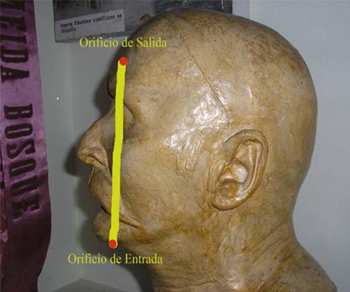 Reconstrucción que señala los orificios de entrada (mentón) y de salida (frente).
