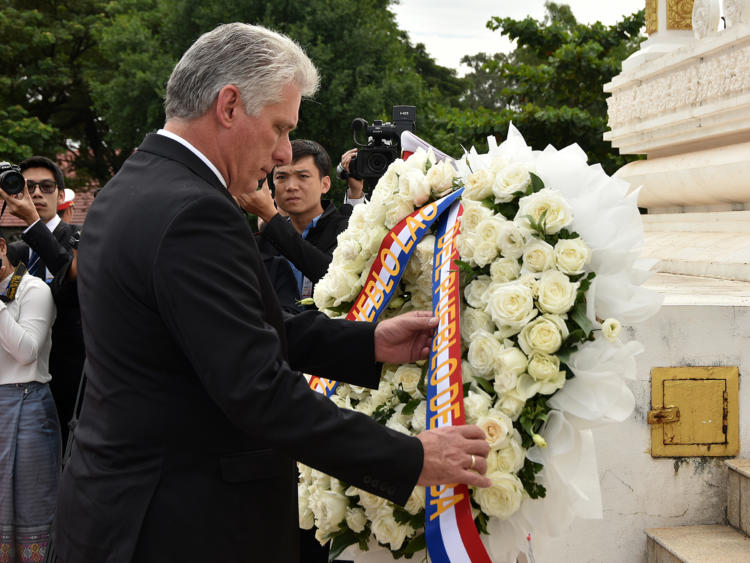 El Monumento al Soldado Desconocido fue el siguiente lugar visitado por el mandatario cubano. Allí, a nombre del pueblo de Cuba y dedicada a los héroes del pueblo lao, el mandatario colocó una ofrenda floral como otra prueba evidente de que, a pesar de las largas distancias geográficas de por medio, lazos muy sólidos y diversos mantienen muy cerca a la Isla caribeña y a la República Democrática Popular Lao.