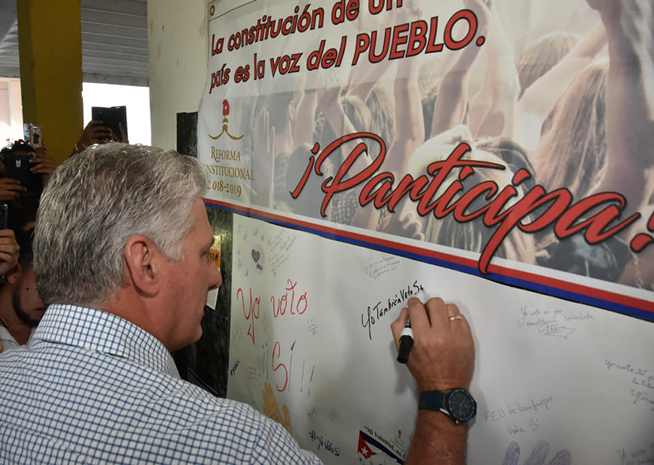 Antes de concluir su recorrido por el centro educativo, el mandatario cubano intercambió con una representación de sus estudiantes y profesores y plasmó en uno de los murales de la institución Yo También Voto Sí, en medio del júbilo y las emociones, reportó la periodista Yaima Puig Meneses.