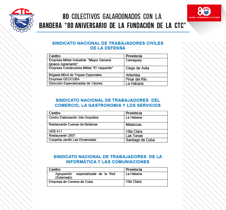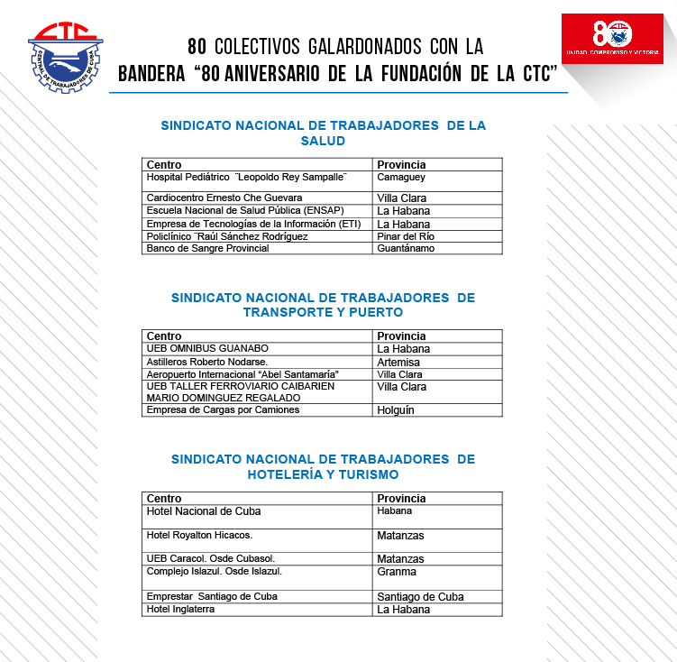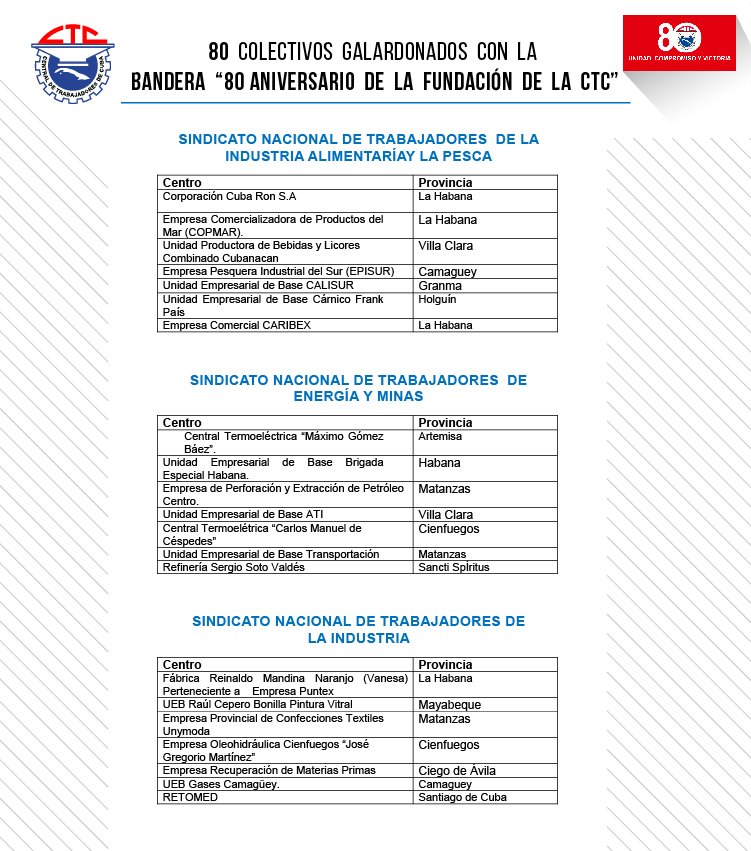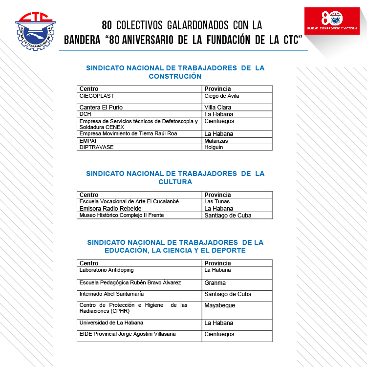 1. Felicidades a todos estos colectivos vanguardias de nuestra Central de Trabajadores de Cuba. Muchas felicidades y a seguir adelante!!!