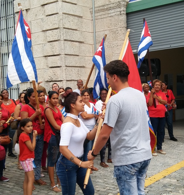 Durante el acto de recibimiento de la Bandera, Claudia García, secretaria general del sindicato en el restaurante El Polinesio, colocó la enseña en manos del trabajador Darién Blanco Hernández, del Museo de los Bomberos, instalación excelentemente restaurada el pasado año, en saludo al 325 aniversario de la fundación de la Atenas de Cuba.