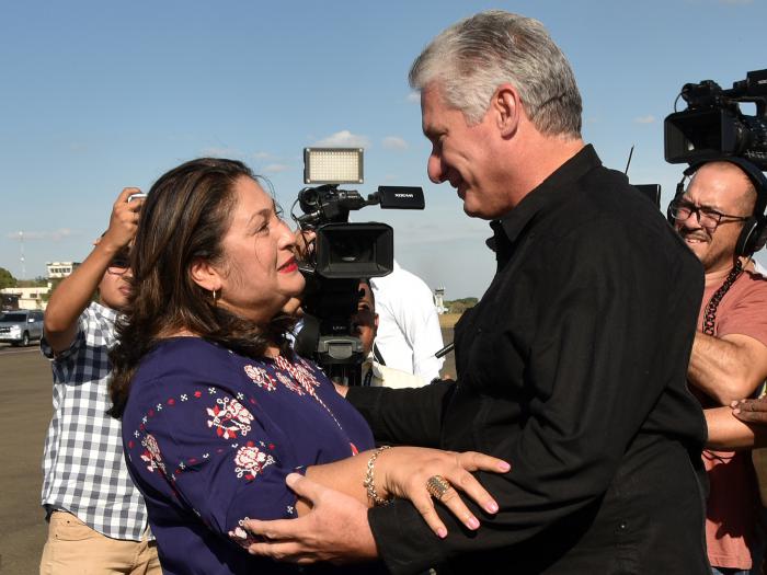En la pista de aviones del Aeropuerto Internacional Augusto C. Sandino, el Jefe de Estado de la República de Cuba fue recibido por Sidartha Marín, ministro asesor presidencial para temas internacionales del país anfitrión, y la ministra de Defensa, Martha Elena Ruiz Sevilla.