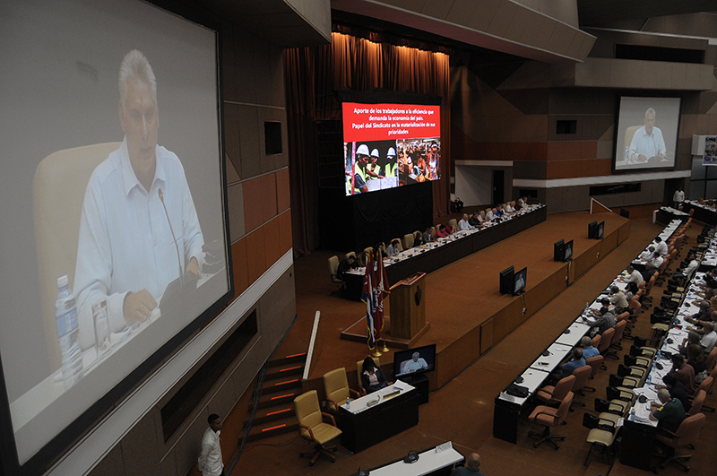 “Este es un Congreso de estos tiempos para enfrentar las situaciones que afrontamos”, expresó Miguel Díaz-Canel Bermúdez, Presidente de los Consejos de Estado y de Ministros, al intervenir en la Comisión número dos del evento más importante del movimiento sindical cubano, en su edición XXI, el que se efectúa en el Palacio de Convenciones, de La Habana.