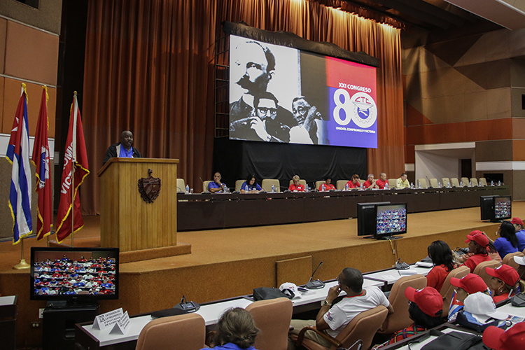 Minutos antes, se había dirigido también al plenario del cónclave, el español Félix Ovejero, responsable para América Latina de las Comisiones Obreras (CC.OO)., quien elogió la proclamación de la nueva Constitución Cubana en fecha reciente y rechazó la intervención de Estados Unidos en Venezuela, exigió la libertad de Julian Asange y Lula Da Silva, así como denunció el ilegal bloqueo económico de Estados Unidos contra Cuba y la aplicación del Título III de la Ley Helms-Burton.