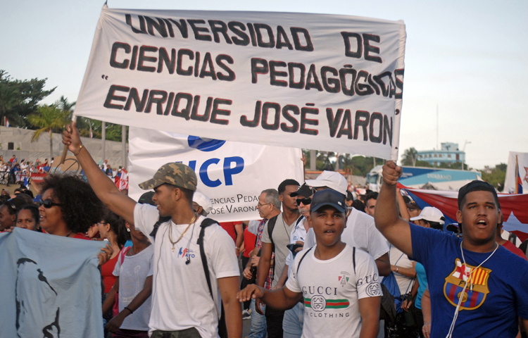 Los muchachos de la Federación Estudiantil Universitaria, con el emblema que identifica a su organización; los trabajadores Civiles de la Defensa, combatientes de las Fuerzas Armadas Revolucionarias y del Ministerio del Interior portando banderas cubanas y estudiantes de escuelas de enseñanza militar, así como una amplia representación de la Unión de Jóvenes Comunistas y la Federación de Estudiantes de la Enseñanza Media, multiplicaron el entusiasmo y cerraron el Desfile con sus iniciativas, pulóveres verdes, blancos, azules rojos.