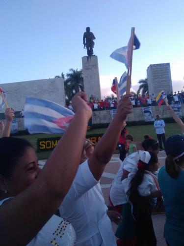 Banderas, flores, homenaje al héroe de América, que se levanta en esta hora de lucha por los pueblos del continente, se rinde tributo a los guerrilleros de las gestas que han dado la libertad, al líder de la Revolución, se grita: Somos fieles, Somos continuidad, Somos Cuba, Somos Fidel.