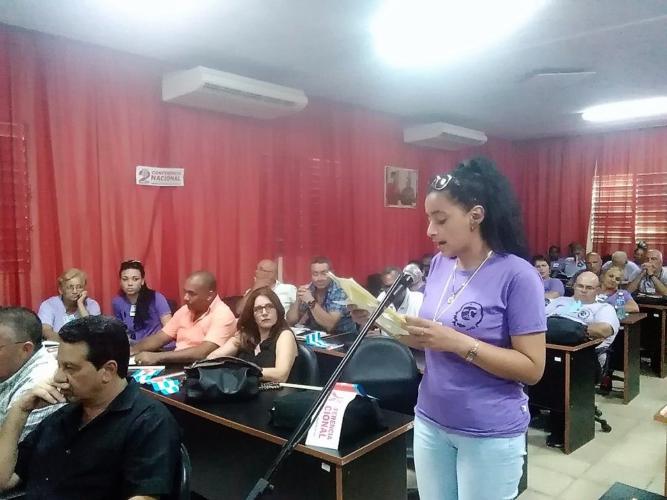 «Contra mi país, mi tierra, mi casa y mi fábrica, no nos entendemos Donald Trump», sentenció Yaniet Zaballa Geada, secretaria general de la sección sindical en la unidad comercializadora avileña de equipos y piezas, al darle lectura a la Declaración contra el bloqueo económico y la Ley Helms-Burton, en la II Conferencia Provincial del Sindicato Nacional de Trabajadores de Industrias (SNTI), en Ciego de Ávila.