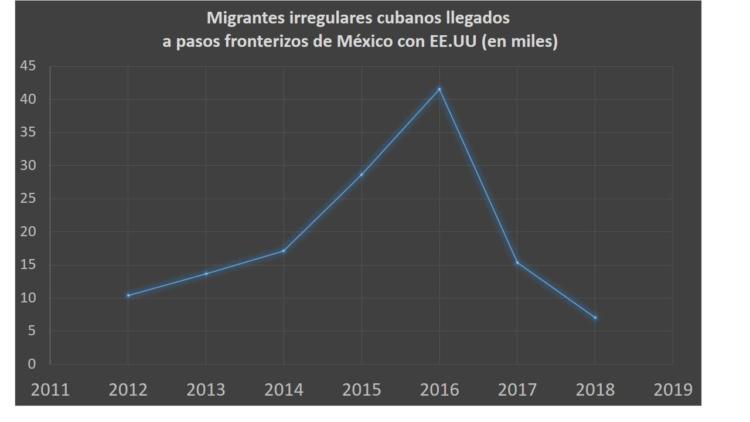 De unos 17 mil y 28 mil migrantes irregulares cubanos en los años 2014 y 2015, con un pico de 41 mil 523 en el 2016, la cantidad descendió a solo 7 mil 79 en el  2018.