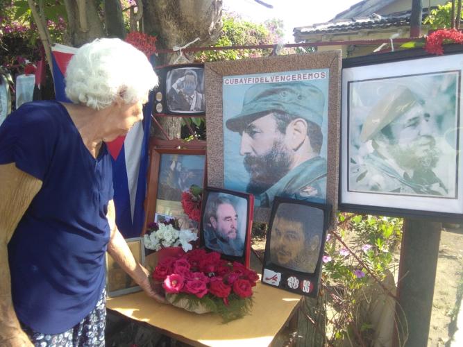 Acomoda también las flores en el sitial histórico que erigieran en el patio de su hogar, en recordación a su compañero Rafael Nazco Sotolongo, los miembros de la organización de base de la Asociación de Combatientes de la Revolución Cubana. «Mi esposo fue el de la idea de celebrar el cumpleaños de nuestro eterno líder, siempre lo acompañé en vida en los preparativos y la realización de la actividad que celebramos hace más de tres décadas y se mantendrá hasta mi último aliento».
