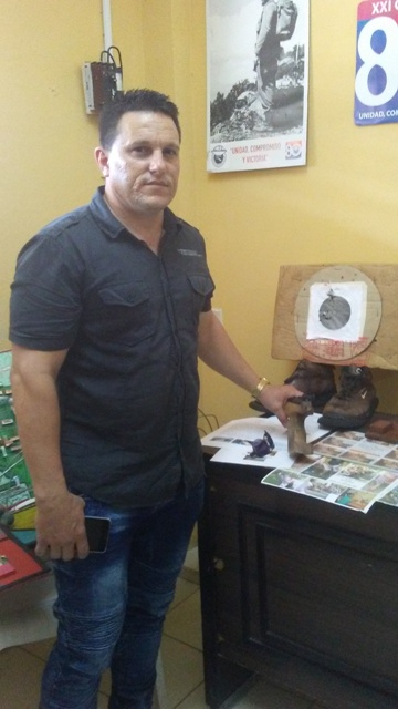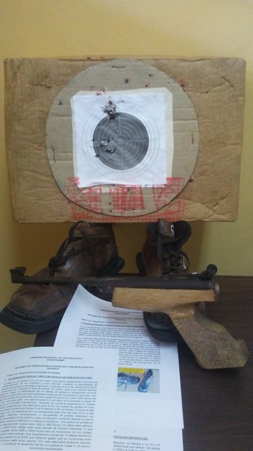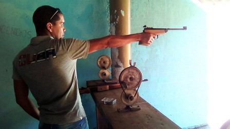 A su lado también me describe la conversión de un fusil IJ38 a pistola. La iniciativa debutó hace aproximadamente cinco años y ya se han confeccionado tres en el país, de las cuales todas están en Guantánamo. Conservan el mecanismo interno, acortando el cañón y se acopla a un recorte de madera en roble; pesa lo mismo que su antecesora (2 kg) con la novedad de posibilitar una mayor inclinación de la muñeca, propiciando las condiciones y requerimientos del tiro adecuado.