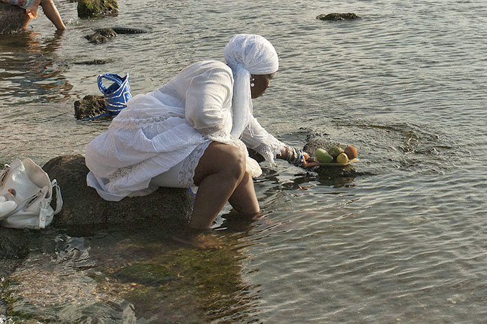 El artista recrea mediante efectivos encuadres  la mística relación entre la deidad de las aguas saladas y los practicantes de la Regla de Ocha (santería), quienes le ofrecen, como muestras de gratitud o devoción, disímiles ofrendas —frutas, flores, dulces, rezos, velas encendidas, cantos con tambores batá…— a la orilla del mar, sobre todo en las crestas de las olas al chocar contra las costas y los arrecifes, rítmico movimiento muy similar al baile de esta osha de cabecera que, entre otros muchos atributos, representa al útero como fuente de la vida, la fertilidad y la maternidad.