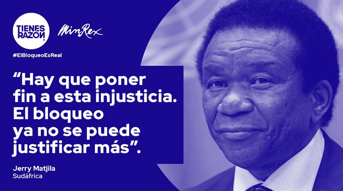 Al concluir el debate de la resolución Necesidad de poner fin al bloqueo económico, comercial y financiero impuesto por los Estados Unidos de América contra Cuba, ante la Asamblea General de Naciones Unidas, el canciller cubano Bruno Rodríguez Parrilla, destacó, a través de su página en Twitter, el apoyo abrumador de la comunidad internacional al levantamiento del bloqueo y el fuerte rechazo a la ilegal y criminal política del gigante del norte, “violatoria del Derecho Internacional, de marcado carácter extraterritorial, que daña a nuestro pueblo y constituye el principal obstáculo a nuestro desarrollo”.