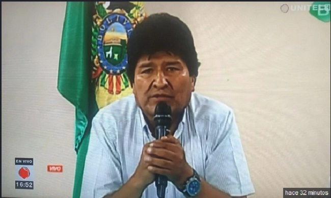 Renuncio para preservar la paz en Bolivia, acaba de declarar Evo Morales en vivo por la cadena Telesur, que encadenó con el sistema informativo de la televisión cubana para dar la noticia.