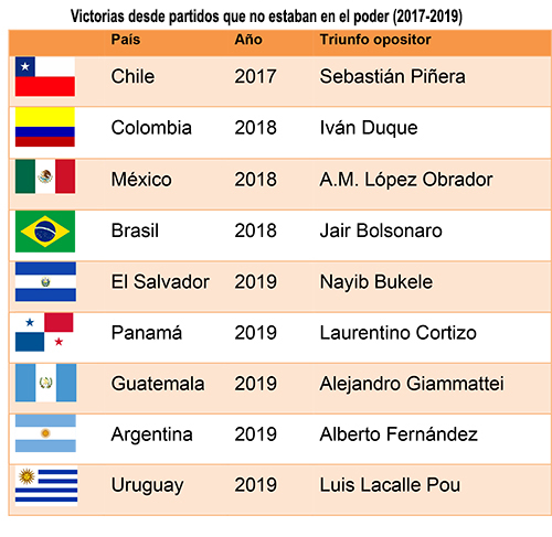 En el 2019 otras seis naciones latinoamericanas acudieron a las urnas: El Salvador (3/2), Panamá (5/5), Guatemala (11/8, segunda vuelta), Bolivia (20/10), Argentina (27/10), y Uruguay (24/11, segunda vuelta).