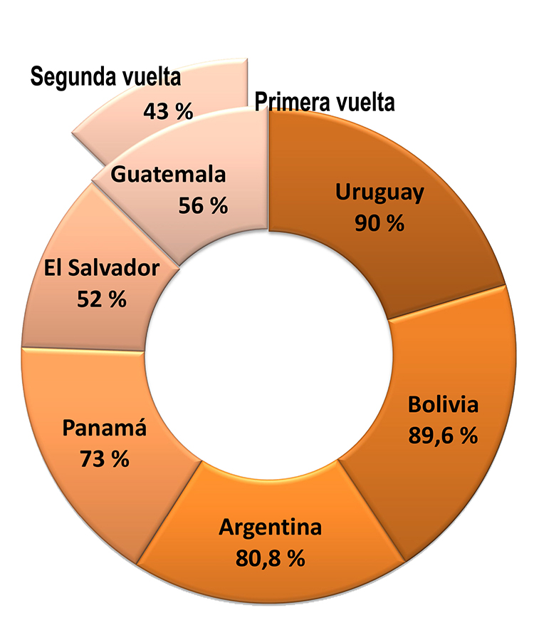 En otras naciones, donde votar es derecho, no obligación, como ocurre en El Salvador, acudió el 52 % del padrón electoral; y en Guatemala el 56 % en la primera vuelta, y el 43 % en segunda.