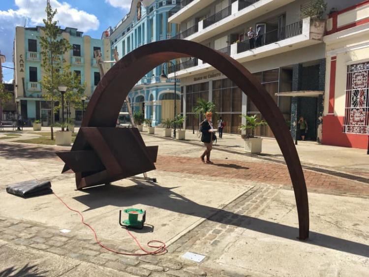 Se ultiman detalles de la escultura Arcada, de José Villa Soberón, que se instala en la céntrica plaza de los trabajadores y que inaugurará el Simposio. Foto: Leandro Armando Pérez Pérez